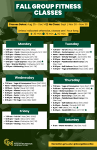 Group Fitness ScheduleHome / Fitness / Group Fitness / Group Fitness Schedule Fitness Group Fitness Group Fitness Schedule Private Group Fitness Classes Class Descriptions Personal Training Meet The Personal Trainers Online Personal Training Registration How to Sign Up Fitness Events Exercise is Medicine Mentor Program InBody Scans- Personal Body Composition Policies Heavy Bag Policies Personal Training Session Policies FALL 2025 SCHEDULE